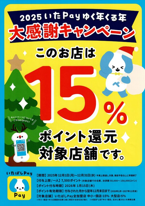 12月より板橋ペイ最大15%還元キャンペーンが始まります! 期間:12月1日~12月31日